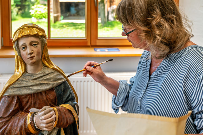 Ich restauriere fachgerecht Kunst- und Kulturgut unter Anwendung erprobter Techniken und Materialien. Die Bewahrung des Originalzustandes und der Erhalt der Patina sowie der Respekt vor dem Alter gehören zu meinem Handwerk. So wenig wie möglich und so viel wie nötig, um Ursprünglichkeit zu erhalten.